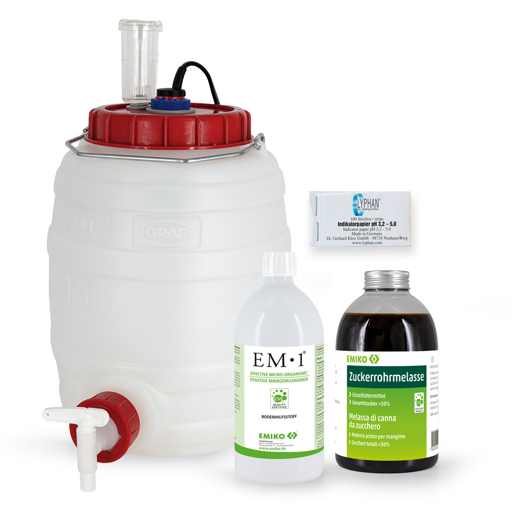 Zu Beginn muss die richtige Größe des Fermenters gewählt werden. Für welche Anwendungsbereiche EMa produziert werden soll, überlegt man sich also im Vorfeld. Für die Auswahl ist es hilfreich, eine Liste mit Aufwandmengen zu erstellen, die innerhalb von ein bis zwei Wochen benötigt werden: Eine Woche dauert es bis ein neuer Ansatz EMa fertig ist und jedes fertige EMa sollte innerhalb von zwei Wochen verbraucht werden.